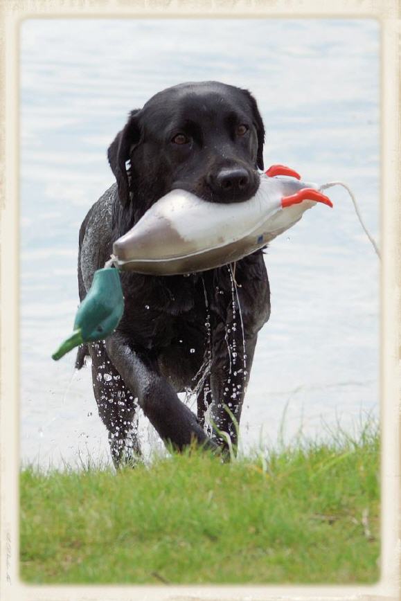 Die Familie Haider/Jahn aus Lünen unterstützt im März 2013 Queenies Ausgleichssport zur Therapiehundearbeit mit einem Dead Fowl Trainer (Ente) für Retriever.